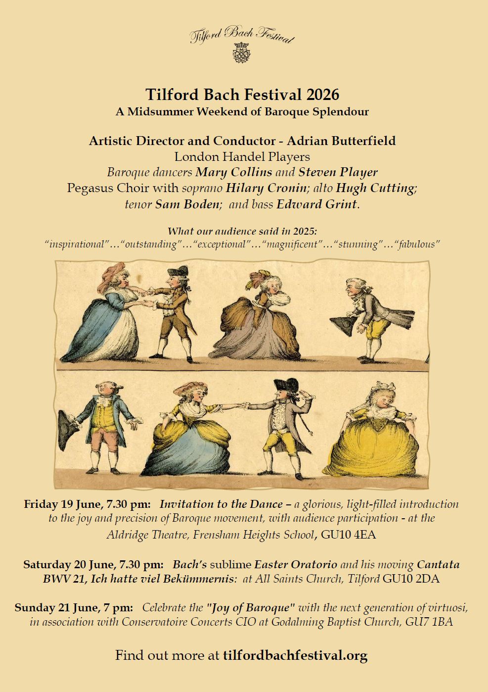 The original Tilford Bach Society, with its current Music Director Adrian Butterfield, runs the Tilford Bach Festival and is a separate charity.